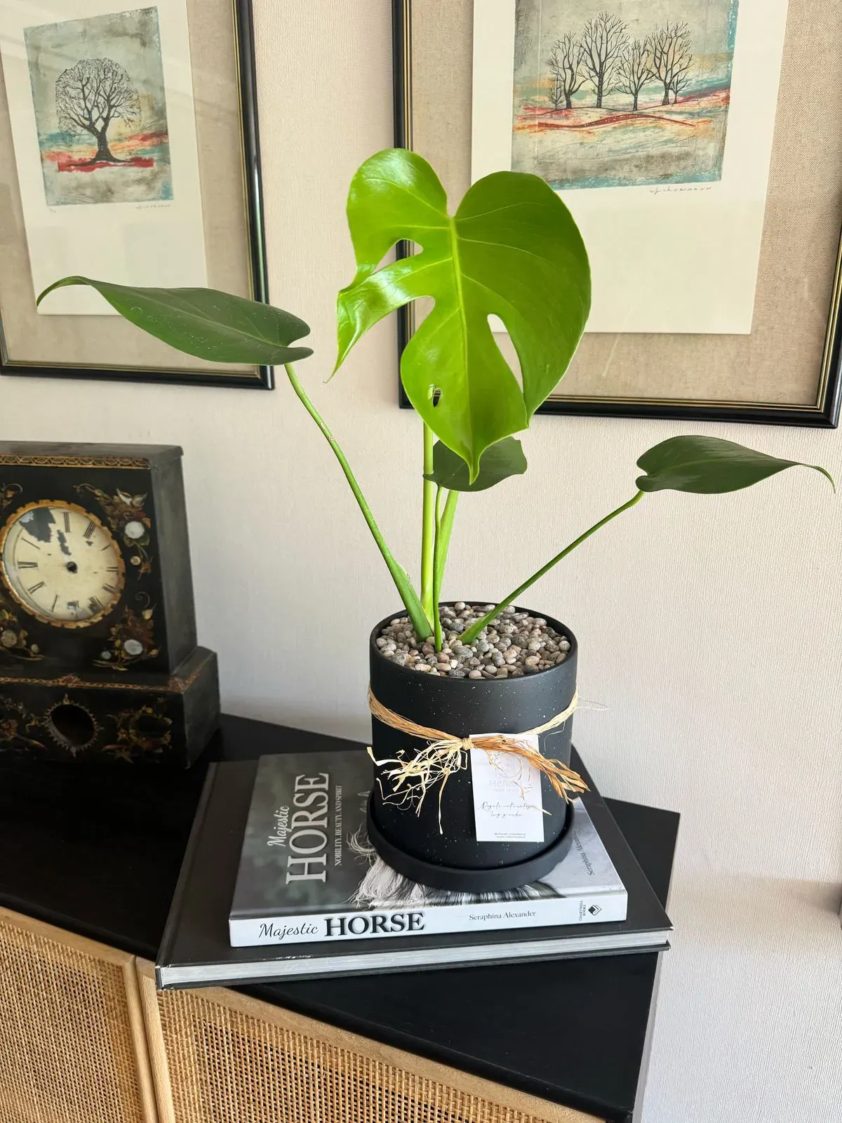 Exuberante, tropical y profundamente expresiva. Sus hojas grandes, perforadas y brillantes, evocan mapas de vida y expansión. Es una planta resistente, de crecimiento generoso, que transforma cualquier espacio con su presencia vibrante y elegante. Sus raíces aéreas buscan soporte, lo que la convierte en símbolo de crecimiento guiado.